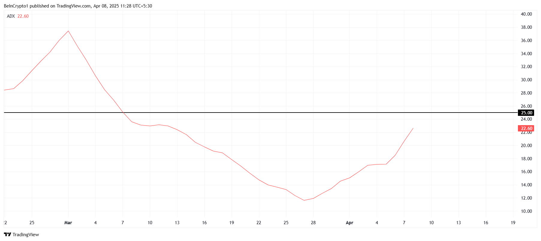 기술 지표인 ADX가 나타내듯이 XRP의 전체 매크로 모멘텀은 현재 약합니다. ADX가 22로 25의 임계값 바로 아래에 있어 현재 하락세가 강해질 수 있음을 시사합니다. ADX가 25를 넘으면 하락세가 강화됨을 확인하게 되어 XRP 가격의 추가 하락으로 이어질 수 있습니다.