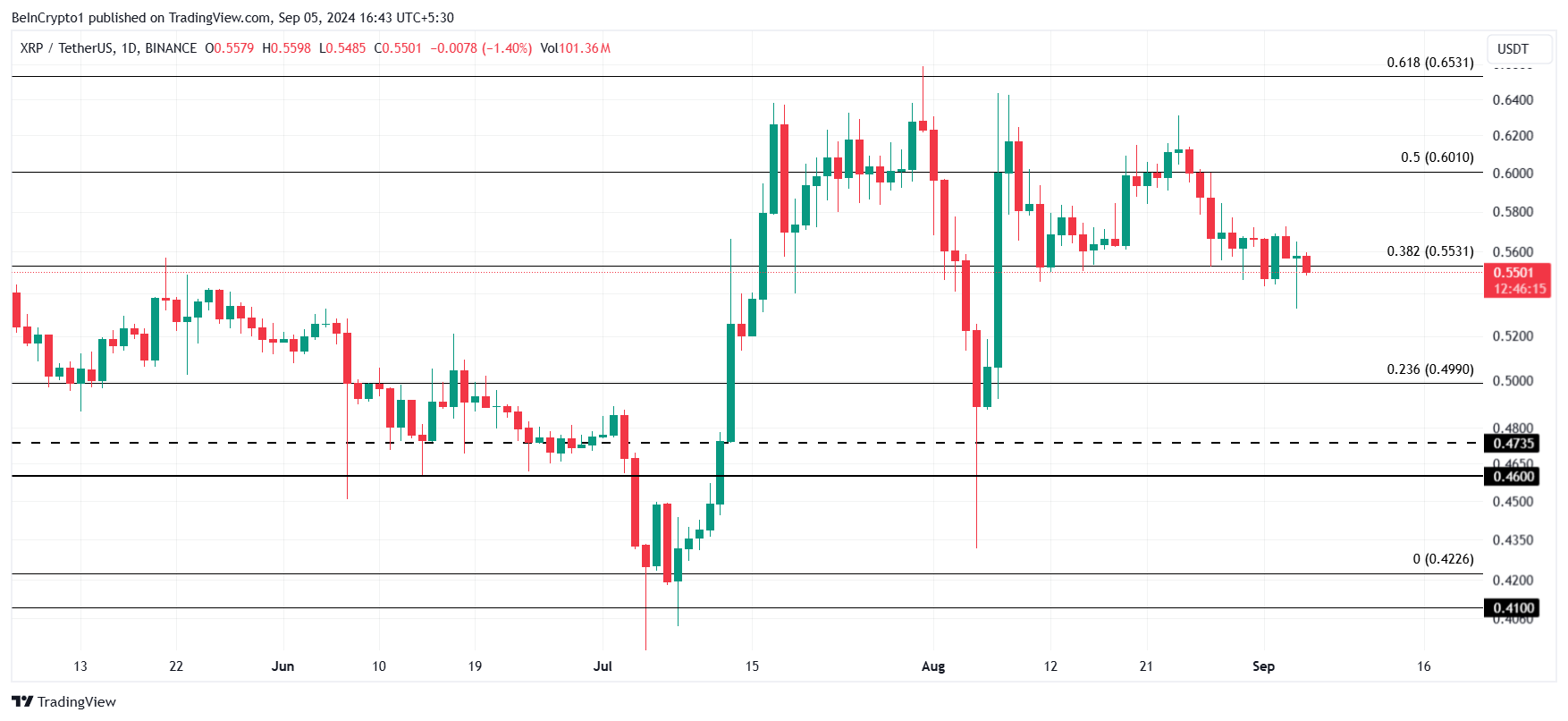 한편, XRP는 지난 72시간 동안 큰 하락을 보이지 않았습니다, 이는 급격한 하락을 피할 수 있음을 나타냅니다. 만약 암호화폐가 0.553달러를 지지 수준으로 다시 확보한다면, 현재의 약세 전망을 무효화할 수 있습니다. 이 경우 XRP는 0.60달러로 반등할 가능성이 있어, 잠재적인 상승 반전을 제공할 수 있습니다.