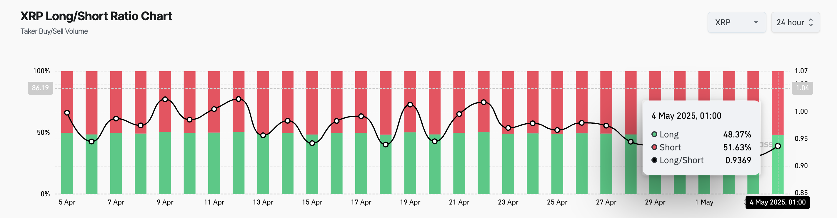 XRP 롱/숏 비율은 시장에서 롱 포지션(가격 상승에 대한 베팅)과 숏 포지션(가격 하락에 대한 베팅)의 수를 비교합니다.