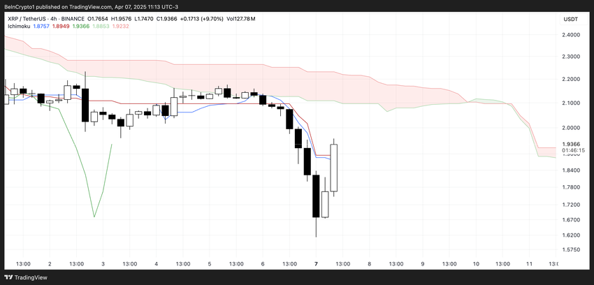 XRP의 일목균형표 차트는 약세 구조를 보여줍니다. 가격은 구름(Kumo) 아래에서 거래되고 있어 강한 하락 모멘텀을 나타냅니다.