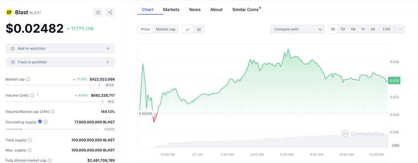이와 관련된 소식으로, 이더리움 레이어 2 확장 네트워크 블래스트는 에어드랍을 통해 네트워크 얼리 어답터들에게 170억 개의 BLAST 토큰을 배포했습니다. 블래스트는 토큰당 0.02달러에 데뷔하여 출시 당시 20억 달러의 완전 희석 가치(FDV)를 달성했습니다.