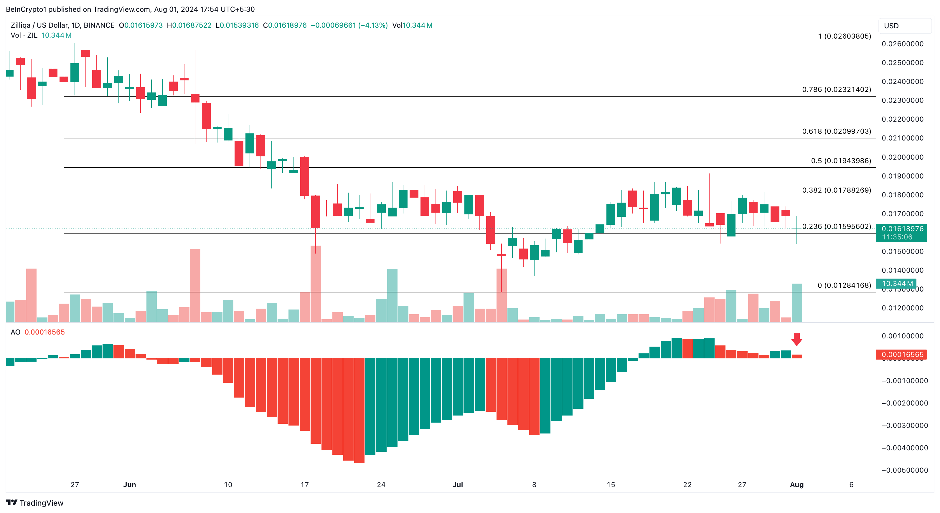 ZIL의 가격 움직임에 대한 추가 평가에 따르면 토큰이 시간이 지남에 따라 바닥을 다지는 것을 경험할 수 있습니다. 이 이론의 근거 중 하나는 어썸 오실레이터(AO)입니다. AO는 암호화폐의 장단기 가격 움직임을 비교하여 모멘텀을 결정합니다.
